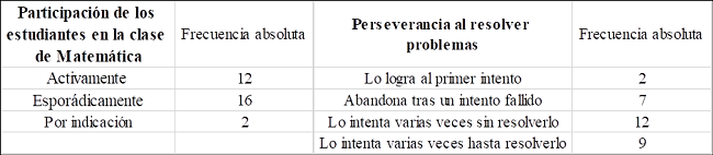 En el aspecto relacionado con la participación de los estudiantes en la clase de Matemática, se observa que el 40% participa activamente en las clases, el 53,3% lo hace esporádicamente, fundamentalmente cuando les interesa la temática de la clase, y el resto (6,7%) de los estudiantes no participa a menos que el profesor le pida que lo haga.