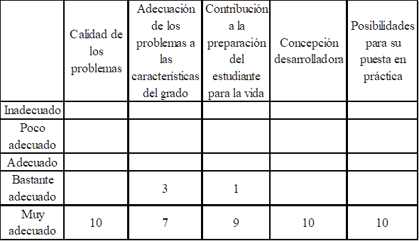 Una vez recopilada y analizada la información ofrecida por estos, se precisan aspectos importantes que permitieron el perfeccionamiento de los problemas elaborados a partir del rigor científico de los señalamientos realizados. En la valoración de la propuesta de los problemas para la aplicación de las funciones numéricas, los especialistas consideran (Table 2):