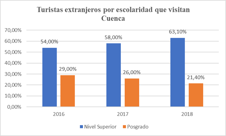 La Figura 1 muestra que el nivel de escolaridad de los turistas extranjeros que visitaron la ciudad de Cuenca en los años 2016, 2017 y 2018 fue elevado. En cada uno de los años analizados más de cuatro quintos de los turistas extranjeros declaran contar con educación superior o de posgrado. Por tanto, hay que considerar que el potencial grado de exigencia de estos turistas es considerable por su capacidad para juzgar críticamente los atractivos culturales de la ciudad.