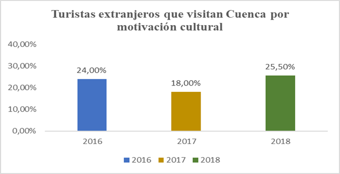 La Figura 2 muestra que los turistas extranjeros interesados en la cultura, que visitaron la ciudad de Cuenca en el año 2016, alcanzaron un porcentaje del 24,00%; y, en el año 2017, el 18,00% (GIER, 2018 :21). En el año 2018 se llegó al 25,50% ( 2019:24). Los resultados muestran que el porcentaje de los turistas mencionados tuvo un crecimiento del 3,08%. La disminución de la llegada de turistas extranjeros a Cuenca, en el año 2017, se explica por el impacto de la construcción del tranvía en el Centro Histórico y la disminución de vuelos.