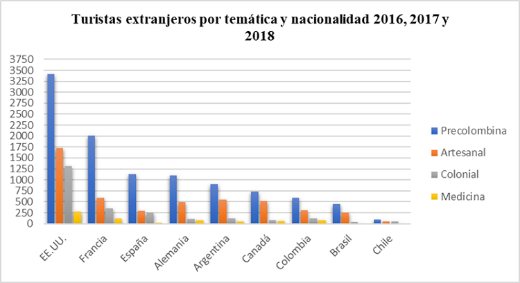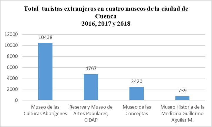 ABSTRACT : Within the framework of cultural tourism in Ecuador, the article addresses a little-studied topic: the particularities of foreign cultural tourists from museums in the city of Cuenca, their sociodemographic characteristics, evolution of the visits and thematic preferences according to the nationality of the visitor in such a way that these tourists can be identified and characterized, which offers practical consequences for the museums in the city. The research follows a mixed paradigm and it is nourished by the analysis of scientific papers, official data from the Ministry of Tourism of Ecuador and the Visit Book of the museums analyzed that corresponds to the years 2016, 2017 and 2018. The quantitative data related to the visits of the cultural tourist to museums are interpreted from the concepts related to cultural tourism. With the previous corpus, the analysis and comparison of the information obtained was carried out by applying descriptive statistics tools and the SPSS version 23 program. The research establishes the potential demands of the public made up of foreign cultural tourists from museums in Cuenca and the challenges to improve the museography, guidance and attention, specifically of those who are involved with the museum institution and cultural tourism.