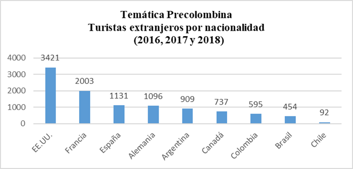 Los datos de la Figura 5 muestran que el mayor número de turistas extranjeros en el período 2016, 2017 y 2018 provienen, en su orden, de cuatro subregiones: América del Norte, Europa Occidental, Europa Meridional y América del Sur, en el caso del museo que mantiene una temática precolombina: Museo de las Culturas Aborígenes.