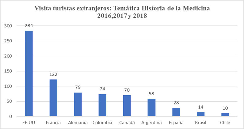 Según la información presentada en la Figura 8 el mayor número de turistas extranjeros en el período 2016, 2017 y 2018, provenía de: América del Norte, Europa Occidental, América del Sur y Europa Meridional, al museo que mantiene la temática sobre historia de la medicina: Museo Historia de la Medicina Guillermo Aguilar M.