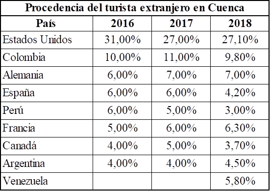 Por otra parte, los trabajos: Estudio de la demanda y oferta turística de la ciudad de Cuenca año 2016 y 2017; y, el Estudio de la demanda y oferta turística de la ciudad de Cuenca boletín anual año 2018 realizado por el Grupo de Investigación en Economía Regional, GIER de la Facultad de Ciencias Económicas y Administrativas de la Universidad de Cuenca, proporcionan información sobre los turistas que arriban a la ciudad de Cuenca.