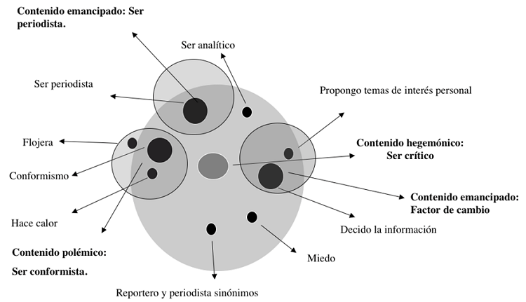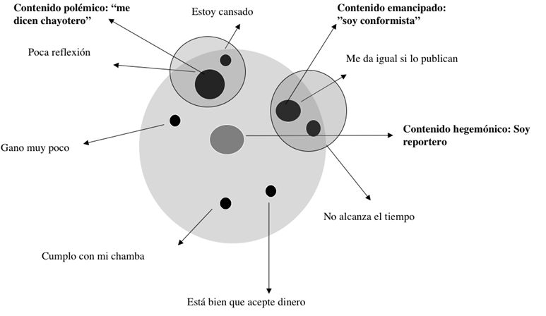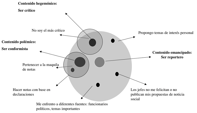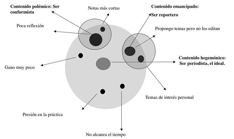 Por otra parte, los contenidos emancipados y polémicos desempeñan un papel distintivo al momento de no seguir las reglas bajo circunstancias específicas, lo que les permite a los periodistas la oportunidad de generar prácticas profesionales no esperadas. Lo anterior indica que la práctica periodística se articula a la constitución de las autorrepresentaciones, a los contenidos hegemónicos, emancipados y polémicos.