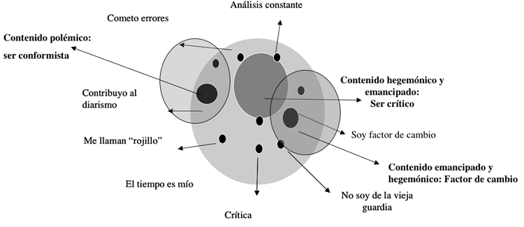 Dicha simultaneidad de roles está relacionada la estructura y contenido de las autorrepresentaciones, que como se explicó en el apartado teórico son polémicas, hegemónicas o emancipadas. Además, se debe a circunstancias sociales específicas a las que se enfrentan los periodistas cada día durante el ejercicio periodístico, y obviamente a lo largo del ciclo de su carrera periodística. Los elementos polémicos y emancipados, que responden a ser los más flexibles de las autorrepresentaciones, aparecen circunstancialmente para generar una práctica nueva en el periodista.
