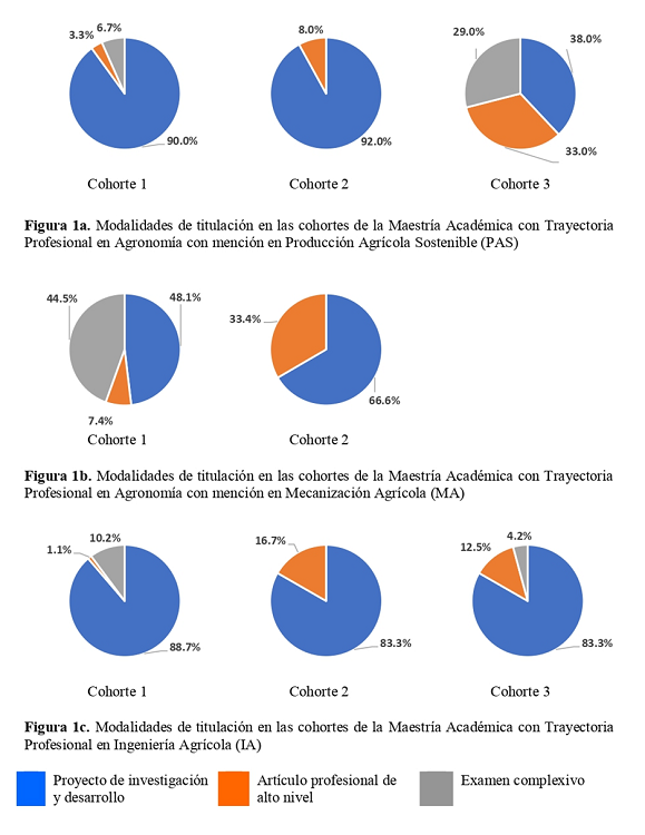 Las figuras 1a-1c muestran las modalidades de titulación (proyecto de investigación y desarrollo, artículo profesional de alto nivel o examen complexivo) elegidas por los estudiantes en cada programa y cohorte, considerando como 100 % la cifra de ETT.