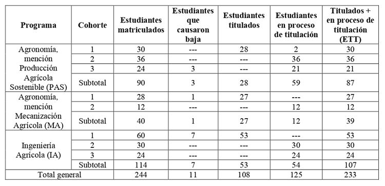 En la UTM, desde 2016 se ha mantenido estable la oferta de tres MATP en el área agropecuaria (Agronomía con mención en Producción Agrícola Sostenible, Agronomía con mención en Mecanización Agrícola, e Ingeniería Agrícola). El objetivo de esta investigación fue analizar las tendencias de la titulación en estos tres programas, como una medida del rigor científico de los ejercicios de culminación de estudios en el posgrado que oferta la UTM. Un estudio de este tipo podría contribuir a la evaluación de la calidad de la enseñanza de posgrado en estos programas, así como brindar información sobre la forma en que el posgrado contribuye a la sociedad a través de resultados científicos publicados, que se incorporan al acervo de conocimientos disponibles para los investigadores y productores.