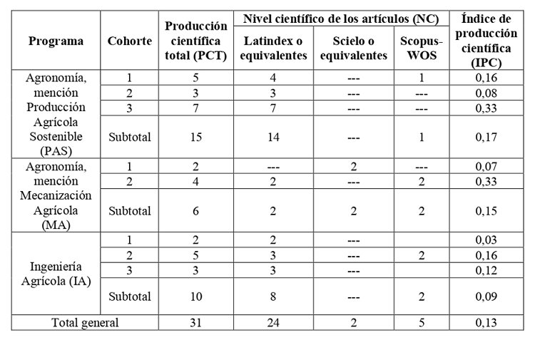 El total general de artículos publicados (31) a partir de los resultados de los 233 estudiantes de los tres programas y cohortes generó un IPC de 0,13. A pesar de la tendencia al incremento en la producción científica total, este IPC puede considerarse bajo si se tiene en cuenta que se han desarrollado o se están desarrollando 233 trabajos de titulación en sus diversas variantes, y la mayor parte de ellos debería conducir a la obtención de resultados publicables.