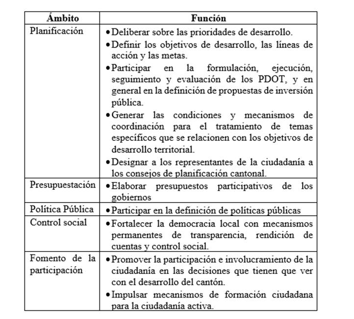 ” (Asamblea Nacional de Ecuador 2010: 27).La determinación legal, que crea el sistema de participación cantonal, no le dispuso una estructura específica a la que debe de regirse, sino tan solo señala las funciones específicas que en diversos ámbitos de la participación debe ejercer de acuerdo con el detalle de la Tabla 1.