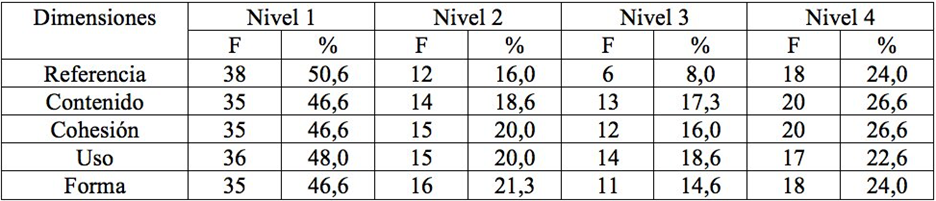 En términos generales, el instrumento incluye cinco dimensiones del lenguaje (referencia, contenido, cohesión, uso, forma), en cada dimensión es posible identificar 4 niveles de desarrollo que van desde el inicial (Nivel 1), hasta el de maduración (Nivel 4).