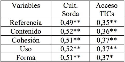 Como se aprecia en la Tabla 2, las variables Referencia, Contenido, Cohesión, Uso y Forma, correlacionan positivamente y, en forma estadísticamente significativa con las variables de conocimiento de la cultura sorda y acceso a TIC en el hogar. A continuación, en la Tabla 3 se presenta información más específica sobre esta relación.