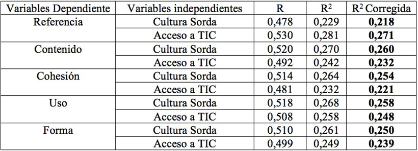 De acuerdo con la Tabla 3, los resultados del análisis de regresión, considerando las variables de competencia conversacional en LSCh como variables dependientes y las variables de conocimiento de la cultura sorda y acceso a TIC como variables independientes o predictoras, señalan que cuando la variable criterio es Referencia, Contenido, Cohesión, Uso y Forma, el porcentaje de varianza explicada por las variables cultura Sorda y Acceso a TIC, que entran a formar parte de la ecuación oscila entre 22,8 % y 27,1 %. Por lo tanto, estas variables permitirían un mayor desarrollo en los distintos componentes de la competencia conversacional en LSCh.