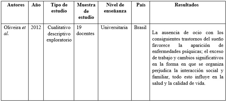 Los resultados arrojados en los estudios analizados confirman que la carga laboral tiene efectos negativos en la CV de docentes de enseñanza media y universitaria a nivel global, incluyendo países pertenecientes a los continentes americano, asiático y europeo, al converger su incidencia en ámbitos de la vida personal, social y laboral, manifestados a través de afectaciones físicas, trastornos del sueño y trastornos psicológicos. Se presenta con mayor prevalencia el Síndrome de Burnout, gatillado principalmente por el estrés (Oliveira et al. 2012).