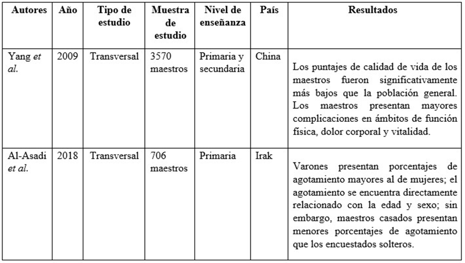 Las indagaciones permiten evidenciar que no existen diferencias entre los distintos países de origen de los estudios, ya que todos son susceptibles a los efectos de la sobrecarga laboral secundaria a factores tales como el ambiente de trabajo, tipos de contrato, temporales o a plazo fijo, remuneración, oportunidades de desarrollo profesional y el apoyo entregado por parte de la dirección de las instituciones educativas.