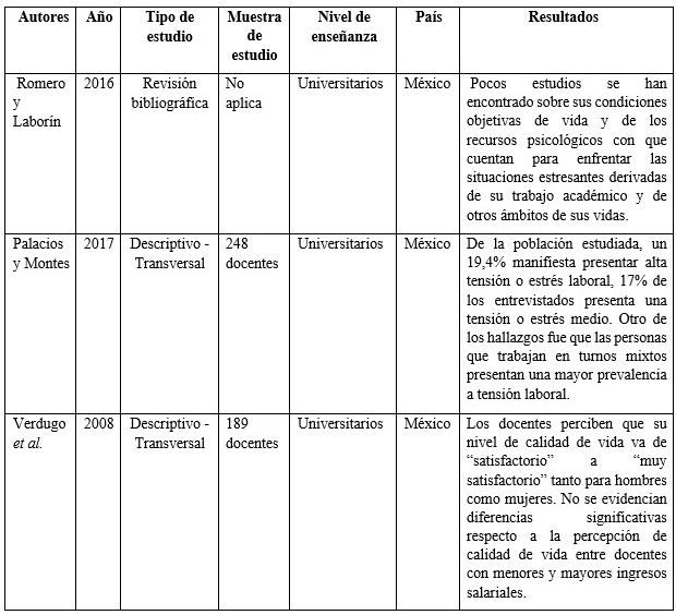 De los tres estudios de México resumidos en la Tabla 3, se destaca que el factor estrés laboral tiene mayor incidencia en la CV en aquellos profesores que trabajan dobles turnos.