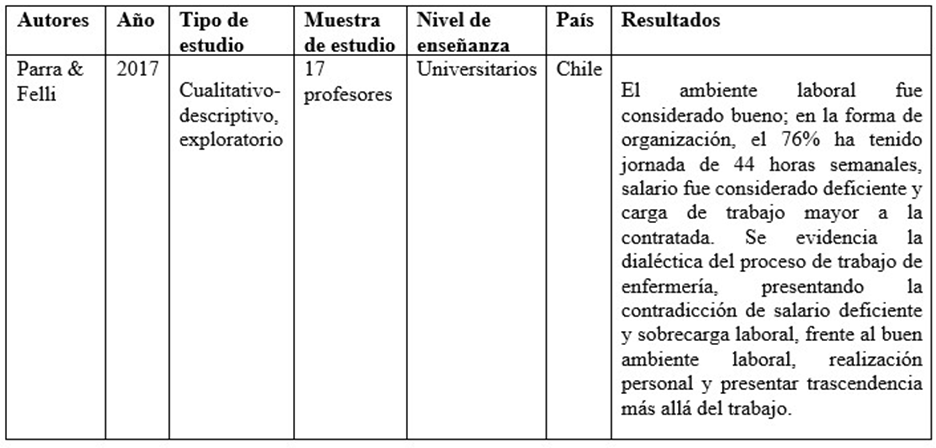 De acuerdo con lo obtenido por estos autores, los docentes universitarios presentan sobrecarga de trabajo y bajos ingresos, si bien se recalca que el ambiente entre colegas es favorable.