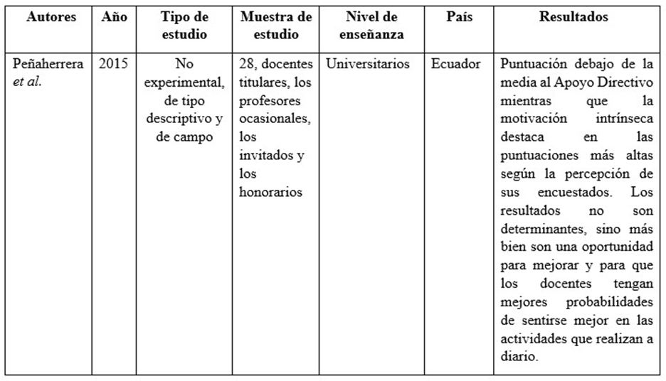 En la Tabla 6 se incluye el resumen de un estudio no experimental, de tipo descriptivo y de campo, cuya muestra corresponde a docentes universitarios de Ecuador.