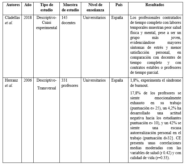 En estos dos estudios los docentes universitarios manifiestan una asociación entre sobrecarga laboral y el desarrollo de patologías psicológicas, entre las manifestaciones más acentuadas se encuentra el Síndrome de Burnout.