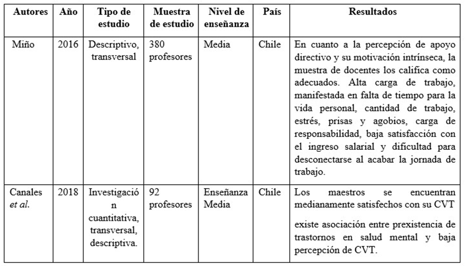 Estos estudios realizados a profesores de enseñanza media de Chile destacan que los profesores tienen una baja satisfacción respecto a su nivel de CV, al manifestar poco tiempo para la vida personal, agobio laboral, exceso de responsabilidades, bajos sueldos, lo que impacta en la generación de estrés. Se destaca el apoyo directivo como factor importante en el desempeño laboral.