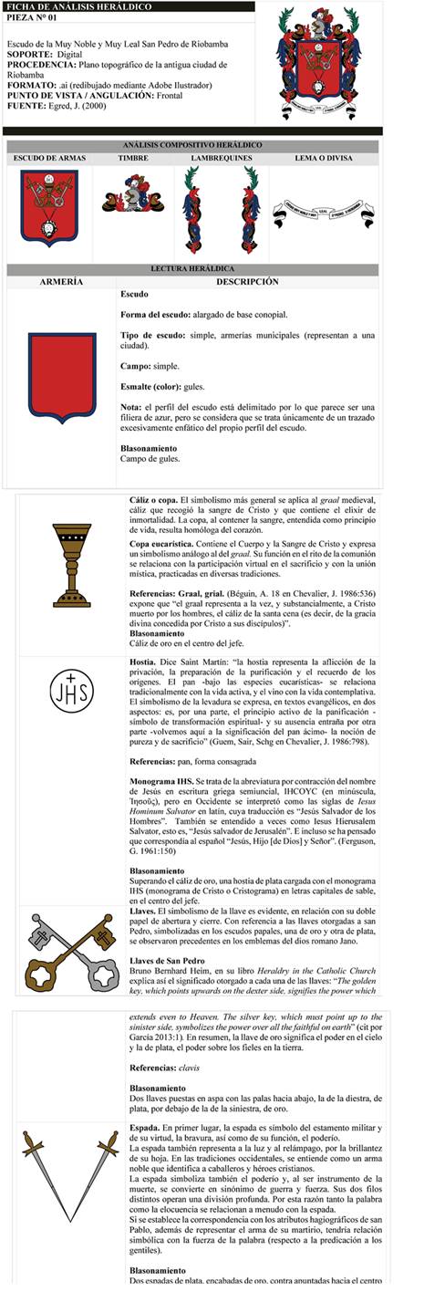 Partiendo de la premisa de que el escudo de armas de Riobamba cumple una función identificadora, bajo el principio de que “remite a su titular, identificándolo como tal” (Montaner 2012:47); considerando que el lema cita textualmente: Ciudad Muy Noble y Muy Leal San Pedro de Riobamba, y acogiendo los datos expuestos por Traversari donde detalla que fue entregado a la ciudad como escudo de armas en reconocimiento de “tan significativa como honrosa distinción” (47), nos adentramos en el análisis de la heráldica eclesiástica, debido a la naturaleza del nombre que a su vez asigna un “santo apóstol” como patrono, San Pedro.