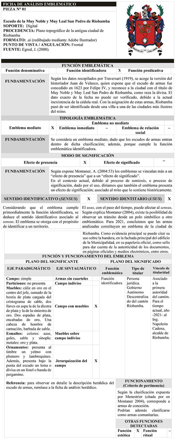 Se toma como unidad de análisis el escudo de armas de Riobamba. Para dar respuesta a la configuración visual del escudo, se aplicaron dos instrumentos específicos: ficha de análisis heráldico y ficha de análisis emblemático, que permitieron realizar una lectura objetiva del escudo.