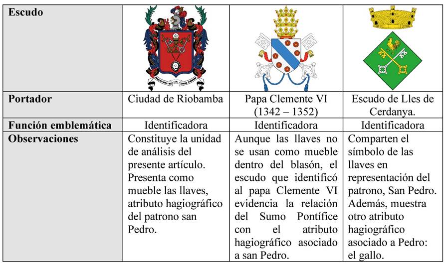 . (Arco del 2012:129)Con esta descripción, queda claro que en el escudo de armas analizado está representado su patrono que le da nombre, San Pedro de Riobamba. Así también, da cuenta expresa de la religión católica, dado que, tanto en el centro del escudo como en el centro del jefe está presente el cáliz y la hostia con el cristograma. Para dejar evidencia gráfica del análisis se presenta a continuación la tabla comparativa de escudos que hacen uso de similares atributos hagiográficos.