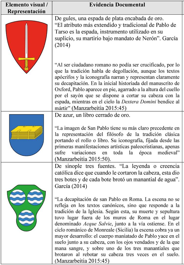 A más de un siglo de distancia y a partir de herramientas propias de la Heráldica, se presentó una interpretación actualizada de tales armerías. En esta se concluye que las espadas se utilizan como atributos hagiográficos de San Pablo y que la “cabeza de hombre” es la representación del mismo personaje.