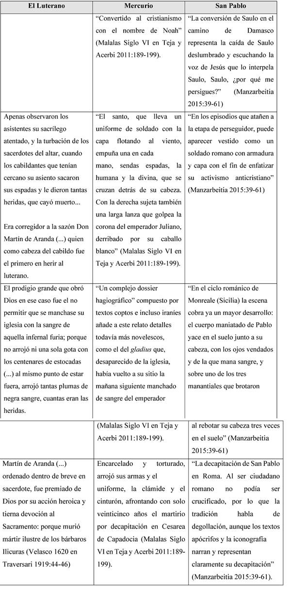 El origen de la narración consignada por el padre Juan de Velasco se establece en un proceso de intertextualidad entre la historia de San Pablo y de San Mercurio. Respecto a Pablo, esta aseveración se fundamenta principalmente en dos “tropos”: muerte por la espada y prodigio respecto a la sangre. En relación con Mercurio-Abu Seifein, el mártir de las dos espadas, se evidencia intertextualidad principalmente en la descripción del hecho de la “muerte de un apóstata” -el emperador Juliano- y de un hereje -Sibelius Luther-, para el caso local.