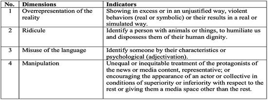 The IVR is composed by 27 dimensions, which have their respective indicators, which means the: “concepts, expressions or media behaviors, whose presence warns of some type of discrimination on a scale of 0 to 1” (CRL 2014:2). According to this scale, zero is equal to content with no violation of rights and one is discriminatory content. The Table 1 details the four dimensions and indicators that were analyzed in the enquiry.