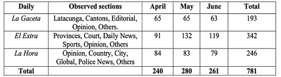 The monitoring was carried out on the newspapers La Gaceta, La Hora and El Extra in their printed version, during the months of April, May and June 2019, the sample consisted of 781 journalistic productions. And the units of analysis were the complete notes of each journal. (See Table 2).