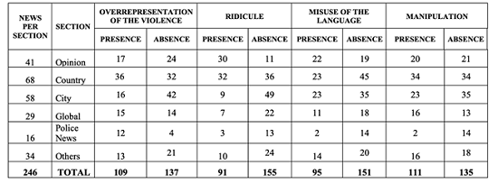 Finally, as can be seen in Table 5, daily El Extra; in three of the four indicators there is a notable absence of rights violations in their informative productions. The over-representation of reality is the predominant indicator of content that violates rights, which is explained by the red chronicle content, characteristic of the newspaper. After sections’ reviewing, it’s evident that the indicator appears more frequently in Court and Provinces. In the remaining sections, there was a higher incidence of informative productions with no violation of rights.