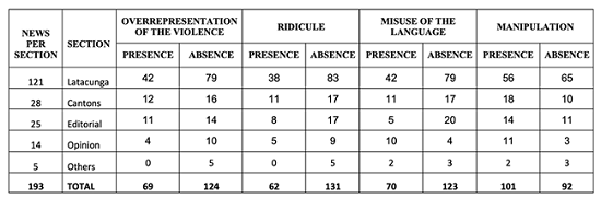 As demonstrated in Table 4, in the case of daily La Gaceta, in three of the four indicators the absence of rights violations predominates in its informative productions. The indicator where the opposite happened was manipulation, that is to say, there was a greater presence of contents that express unequal or inequitable treatment of the protagonists of the informative production, while exposing people in a situation of superiority or inferiority or by conferring a space different from the rest. In this indicator, the section where there is a prevalence of violation of rights is Latacunga. In the rest of the sections, the content with the absence of rights violations remains dominant.