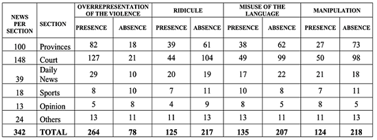 For the analysis, a constant comparative method was applied, defined as one that “seeks to identify the similarities and differences from the inductive analysis of the social incidents observed in the context of the information collected” (Schettini & Cortazzo 2015:36). Triangulation was followed as a qualitative and quantitative integration strategy, the content reviewed by directly inquiring into the productions of the three printed media enable to determine the violation of rights and through the focus group the conditions surrounding information production were closely reviewed. Regarding the ethical considerations, a research’s fundamental factor was the participating journalists’ authorization in the focus group. An informed consent was run based on the targets, scope, and benefits exposure, as well as the probable risks of the research. Such actions were explained at the initial contact and during the focus group articulation. The professionals involved verbally expressed their agreement about the academic use of the information. In this sense, to ensure the anonymity and confidentiality, codes were used to identify their testimonies.