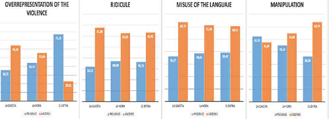Figure 1 shows a comparison of the four dimensions’ results analyzed in the three printed media. In dimension one, overrepresentation of reality, a discriminatory content prevailed in daily El Extra, followed by La Hora and La Gaceta. Dimension two ridicule, showed a lower manifestation of postures that provoke acts of contempt; in all events, the highest percentage occurred in La Hora, followed by El Extra and La Gaceta. In dimension three bad use of language, as in the previous one, less verbal expressions that identifies someone as different due to their psychological or physical characteristics were found.