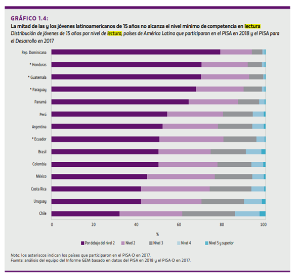 Las brechas de desigualdad siguen siendo profundas, tras la pandemia de la COVID-19 se han agudizado tal como lo demuestra la UNESCO en su informe Inclusión y educación: todos y todas sin excepción “la mitad de las y los alumnos de 15 años en América Latina no alcanzaron el nivel mínimo de competencia en lectura” (2020:10)