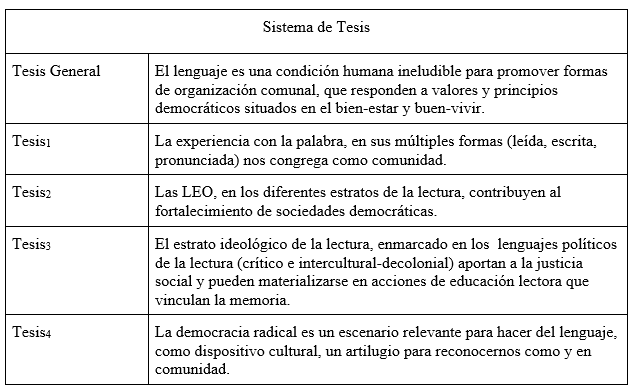 Empero, en el último lustro, con mayor fuerza, la condición social del lenguaje, su comprensión como dispositivo cultural, el entendimiento de las dimensiones políticas y culturales de las LEO ha implicado una mirada compleja y holística de la palabra. Así también, el desarrollo de teorías que reflexionan y respaldan a través de lenguajes políticos de la lectura alternativas para caminar la palabra hacia la justicia social, sino también el desarrollo de propuestas y actividades en el marco de la educación lectora que vinculan la realidad con la teoría y demuestran cómo orgánicamente lo ideológico a manera de alternativa de interpelación nos permite indagar por la memoria a través de la promoción de la lectura.