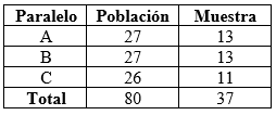 Dada una población de 80 estudiantes constituida por tres paralelos, se calculó una muestra a través de un muestreo aleatorio simple. El tamaño de la muestra obtenida a través del cálculo es de 37 estudiantes, y dado que existen tres cursos, se eligió proporcionalmente una muestra de cada curso como se visualiza en la Tabla 1: