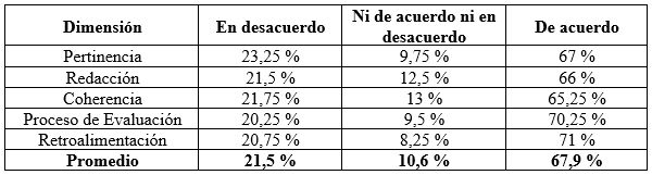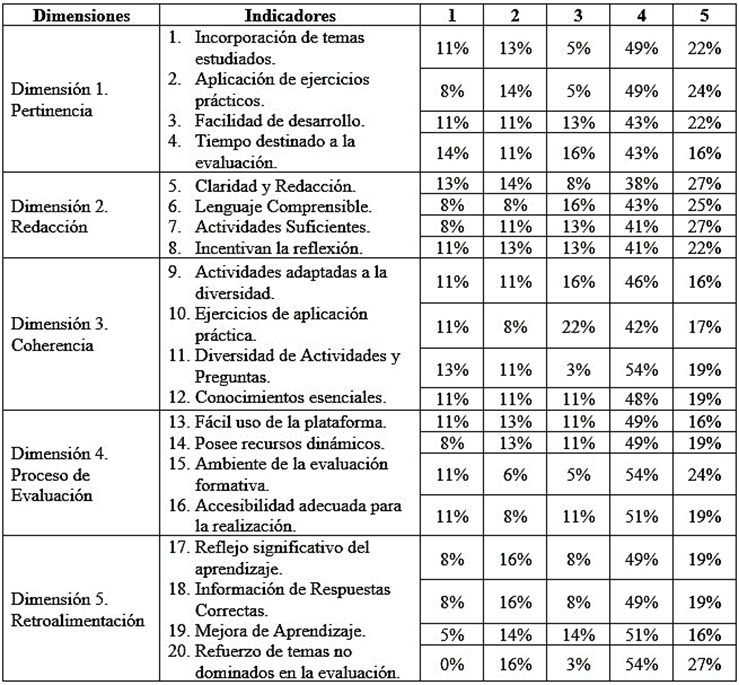 Las dimensiones e indicadores empleados para estimar la calidad de la evaluación se evidencian en la Tabla 2, donde también se reflejan los resultados en forma de porcentajes obtenidos de la encuesta mediante el cuestionario que utilizó una escala de Likert, donde cada valoración representa: completamente en desacuerdo (1), en desacuerdo (2), ni de acuerdo ni en desacuerdo (3), de acuerdo (4) y completamente de acuerdo (5).