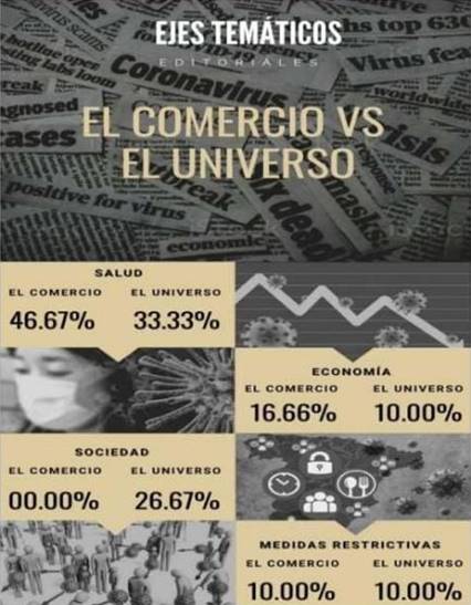El estudio respondió al objetivo de la investigación, pues logró determinar que diario El Comercio le otorgó mayor tratamiento al Covid-19 desde el eje de la salud y economía, a diferencia de diario El Universo que lo trató en más proporción desde el tema de salud y sociedad; mientras que, en relación a las medidas restrictivas ambos medios presentan un mismo porcentaje. No obstante, los textos de opinión de El Comercio no trataron lo social como eje central.