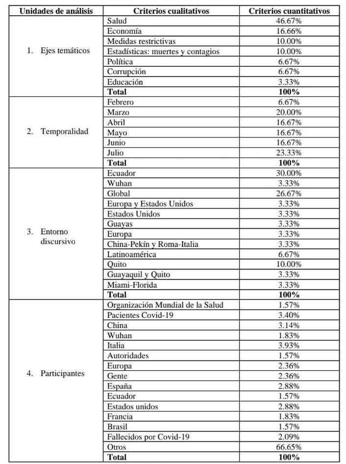 ABSTRACT: This article aims to determine the treatment of Covid-19 in the editorials of the newspapers El Comercio and El Universo. A mixed methodology (qualitative and quantitative) was used; documentary review and critical discourse analysis of 60 journalistic texts published between February and July 2020 were used as techniques. The results showed that health, economy, society, and restrictive measures prevailed in the media's opinion. The discursive environment, the use of language, and the morphology of the discourse served to alert the public opinion about the spread of the virus and its effects, but, at the same time, highlighted the scenarios of power, domination, inequality, and social problems, which translate into weaknesses of the Ecuadorian people.