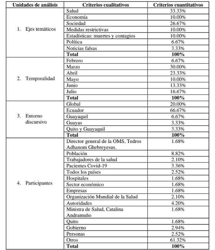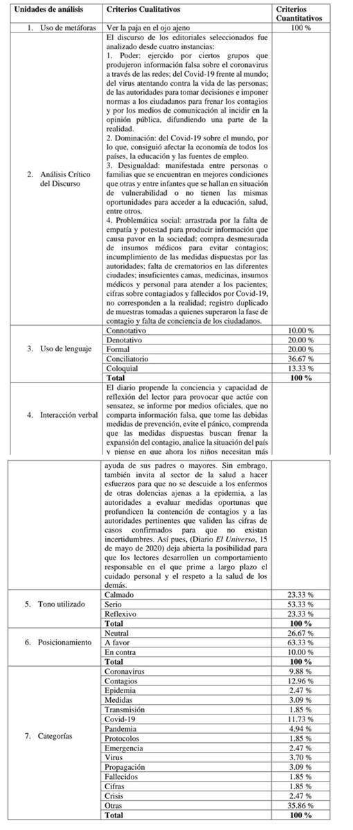 Asimismo, a través de la revisión documental y el análisis crítico del discurso permitieron determinar el tratamiento del Covid-19 en los editoriales publicados en la edición digital de los medios antes mencionados, entre febrero y julio de 2020, por medio de las características de los textos de opinión estudiados, entre ellas se destacan: 1. Diario El Comercio, el 56.67 % de editoriales fueron escritos con un lenguaje formal, la interacción verbal propende la reflexión de los lectores, prevaleció el tono serio con un 53.33 %, el 50 % refleja el posicionamiento neutral del medio y las categorías que prevalecen son pandemia, contagios y Covid-19. 2. Diario El Universo, predomina el uso de lenguaje conciliatorio con un 36.67 %, sus textos propenden la conciencia y capacidad de reflexión de los leyentes, impera del tono serio con un 53.33 %, el 63.33 % del discurso exhibe el posicionamiento a favor del medio y las categorías que sobresalen son contagios, Covid-19 y coronavirus.