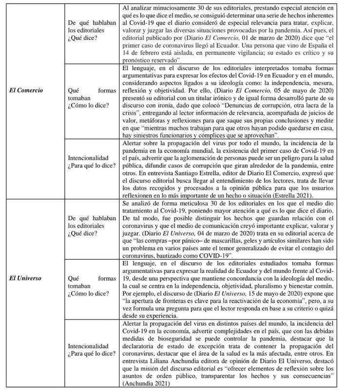 De esta manera, la investigación evidenció que los abordajes realizados por los diarios El Comercio y El Universo reflejaron una diversidad de situaciones relacionadas con el Covid-19. Por ello, a partir de la revisión documental, los investigadores cumplieron con los requerimientos de recolección, procesamiento e interpretación de información útil para el estudio e investigación del tratamiento del Covid-19, en los editoriales de las ediciones digitales de los diarios El Comercio y El Universo, período febrero - julio 2020.