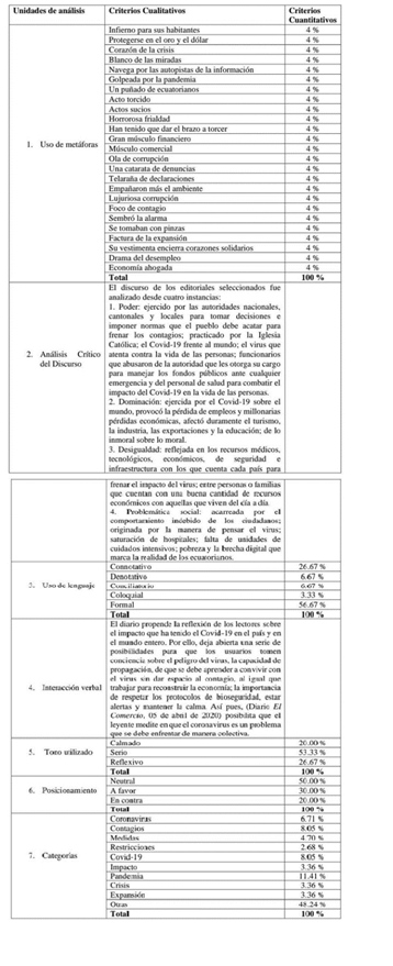 A continuación, se exponen los resultados obtenidos sobre el tratamiento del Covid-19 en los editoriales de los diarios El Comercio y El Universo, publicados entre febrero y julio de 2020. Para un mejor entendimiento, se distinguen criterios cualitativos y cuantitativos resultantes de la aplicación de fichas de análisis, estos se encuentran consignados en tablas.