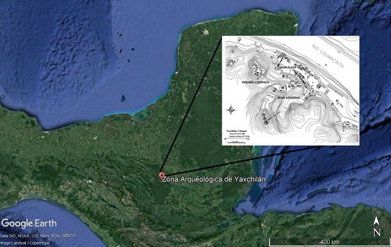 Yaxchilán es una urbe maya prehispánica ubicada en la ribera del Alto Usumacinta en Chiapas, México (Figura 1). En los trabajos de exploración y consolidación, por parte del Instituto Nacional de Antropología e Historia (INAH), que se llevaron a cabo bajo la dirección de Roberto García Moll entre 1973 y 1985, se hallaron diversos testimonios arqueológicos, entre estos: seis tumbas y 36 entierros humanos. Se le denominó tumba a “la construcción de una estructura específica para recibir tanto el cuerpo del difunto como los objetos que lo acompañan” (García 2003:40), en tanto que se designó como entierro al foso simple que se abre dentro de la tierra para depositar al cadáver y que puede o no presentar algún tipo de ofrenda.