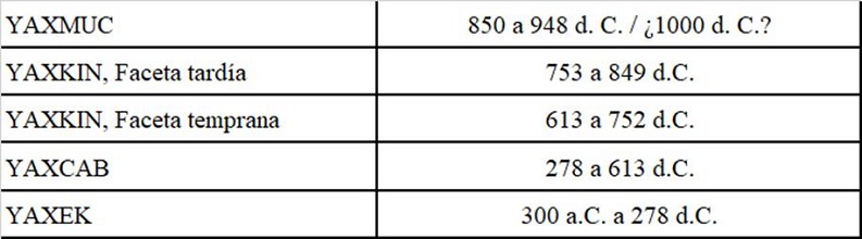 Sobre los resultados generales mencionados, se ha considerado la posibilidad de que las diferencias registradas entre las vasijas puedan referir a cambios tecnoestilísticos ocurridos durante el complejo Yaxkin (613-849 d. C.), lo que puede ser viable si se tiene en consideración que se trata de casi doscientos años. Por lo tanto, se recurrió a los datos arquitectónicos y epigráficos ya aludidos en este trabajo, con la intención de reducir el sesgo cronológico que pudiera existir en la muestra al considerarla en conjunto.