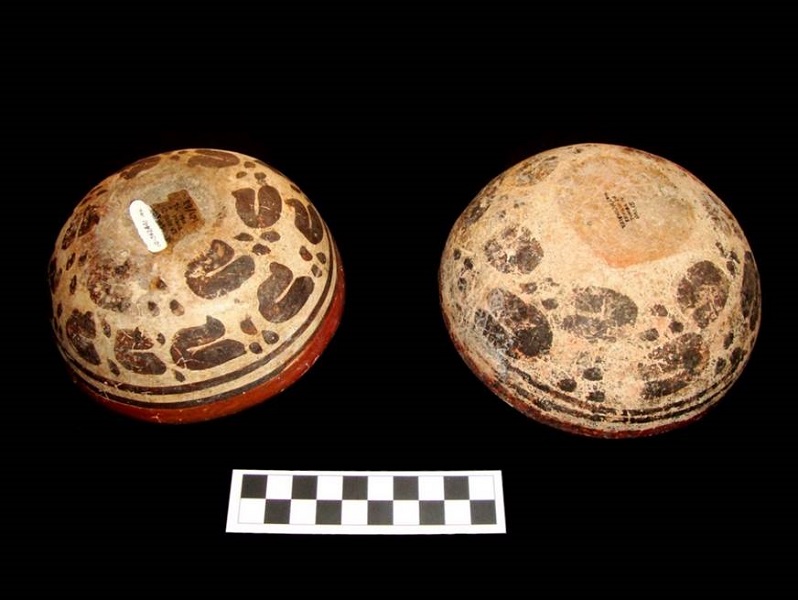 Ahora bien, en el caso de los motivos decorativos, la respectiva Tabla 2 pone de manifiesto que en las vasijas es usual la banda roja sobre el borde, dos líneas negras alrededor del borde (salvo en dos ejemplares), y diseños de paréntesis, que al parecer no siempre se acompañan por los tres puntos, como sucede en siete casos. Así también se identificaron 5 ejemplares con motivos adicionales, que no son característicos del tipo cerámico. Si bien se cuenta con 14 cuencos que comparten el mismo patrón decorativo, la disposición de los diseños varía, pues en 8 casos la secuencia de paréntesis y puntos se encuentra en sentido de derecha a izquierda, mientras que al contrario en 6 ejemplares.