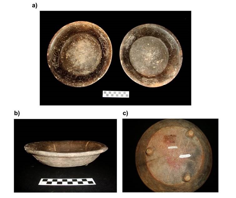 El tipo Zopilote negro manchado se encuentra representado por platos trípodes con engobe café oscuro o negro, los cuales pueden presentar decoración (variedad Inciso) (Figura 5a) o carecer de ella (variedad Zopilote) (Figura 5b).