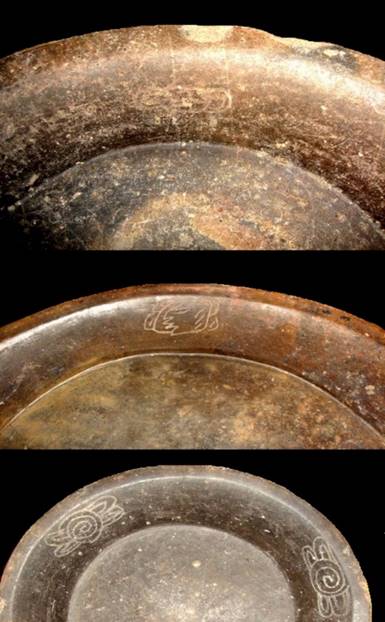 Desde un punto de vista decorativo, aunque los tres ejemplares comparten el patrón decorativo de tres pseudoglifos dispuestos alrededor de la pared interior, en ningún caso son parecidos (véase Figura 6), además que dos de los platos cuentan con rayas verticales esgrafiadas en la pared exterior, mientras que uno carece de este rasgo. Aunado a lo anterior, se pueden señalar los diversos diseños esgrafiados en la base de cada plato trípode (véase Figura 5c).