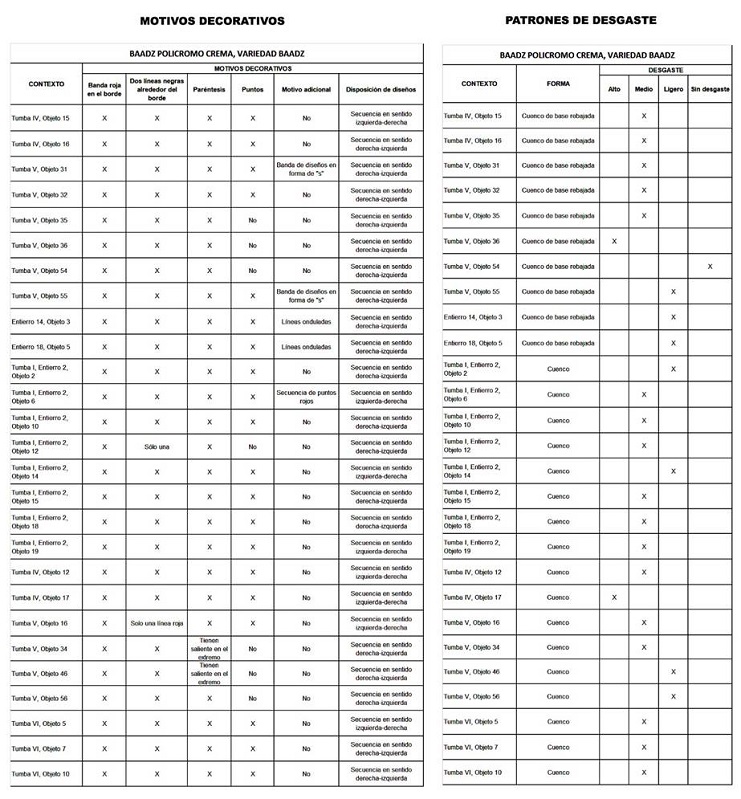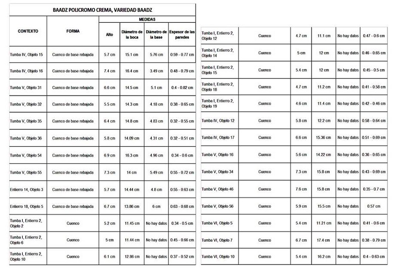 Los resultados de los análisis modales de las 27 vasijas pertenecientes al tipo Baadz policromo crema, variedad Baadz fueron vertidos en tres tablas: una de medidas (Tabla 1), otra de motivos decorativos y una más de patrones de desgaste (Tabla 2). Con respecto a la tabla de medidas, esta indica que 10 de los 27 ejemplares tienen base rebajada y que de manera general las medidas cuentan con los siguientes patrones: una altura que va de entre 4.6 a 7.6 cm, diámetro de la boca de entre 11.1 y 17.4 cm, y espesor de las paredes de entre 0.32 hasta 0.82 cm. Lo apuntado señala que la variabilidad de altura de las vasijas es de 3 cm, mientras que en el diámetro de la boca de 6 cm y el espesor de las paredes de 0.5 cm.